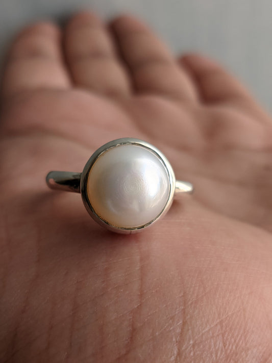 Sterling Silver Pearl Ring, Round Cabochon Stone Ring, Handmade Gift for Her, June Birthstone Ring, White Pearl Jewelry, Rings for Women