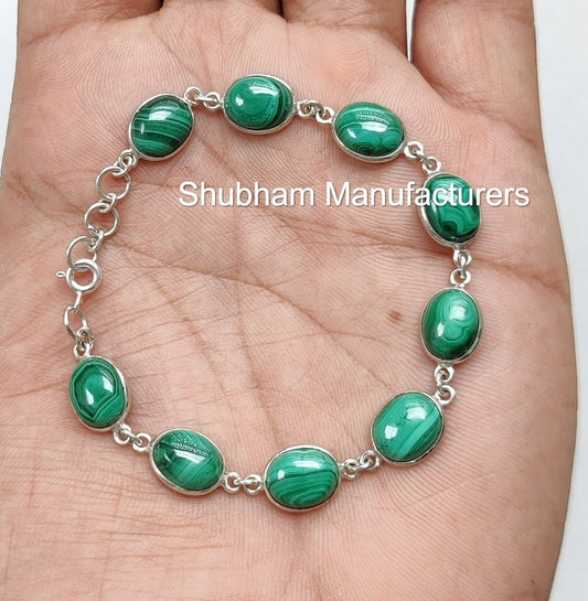 Malachite Bracelet, 925 Sterling Silver Bracelet, Natural Gemstone, Oval Shape, Handmade Adjustable Bracelet, Birthstone Jewelry for Women
