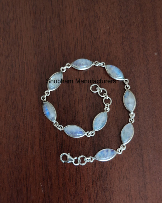 Natural Rainbow Moonstone 925 Sterling Silver Bracelet, Marquise Shape Adjustable Bracelet, Blue Flash moonstone Jewelry, Gemstone Bracelet