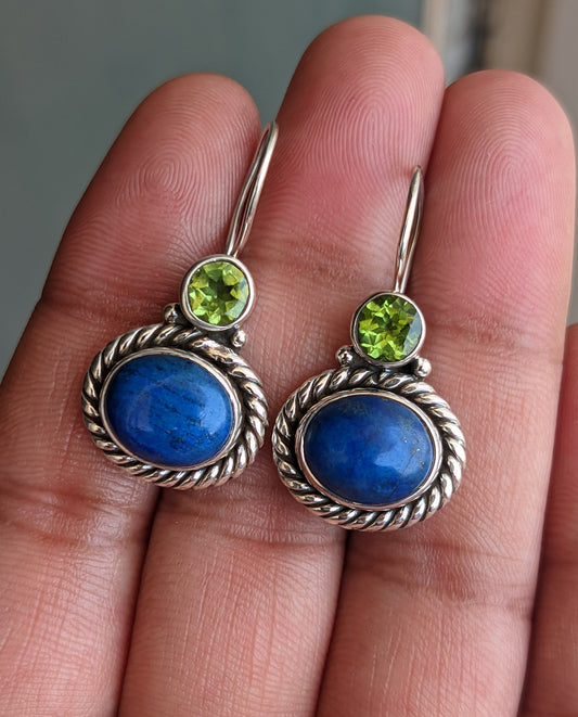 Lapis Lazuli Peridot Earrings, 925 Sterling Silver Lapis Earrings, Handmade Jewelry, Two Stone, Natural Gemstone, Gift for Women, Dangles
