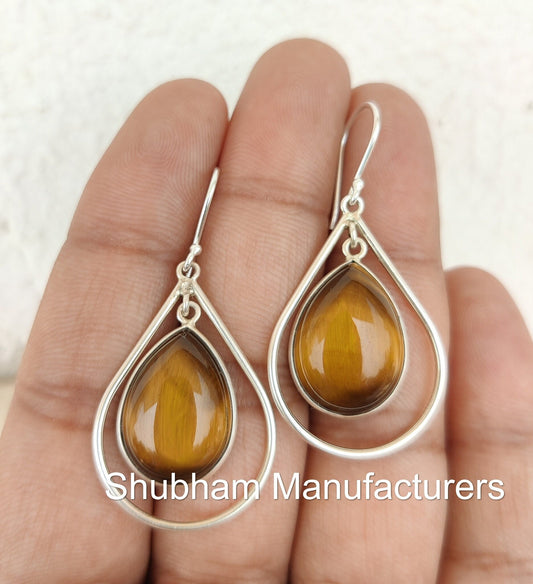 Tiger Eye Dangle Earrings, 925 Sterling Silver Earrings, Tiger Eye Jewelry, Drop Dangle Earrings for Her, Unique Design, Natural Stone