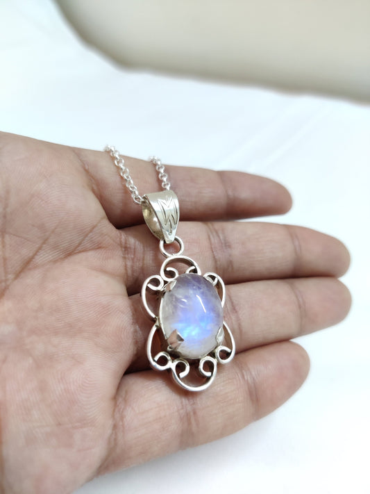 Blue Fire Moonstone Silver Pendant, Natural Rainbow Moonstone Pendant, 925 Sterling Silver Pendant, Birthstone Pendant, Handmade Jewelry