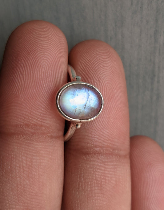 Rainbow Moonstone Ring, Oval Cabochon Gemstone Ring, Stackable Ring, Natural Stone Ring, 925 Sterling Silver, Blue Fire Moonstone