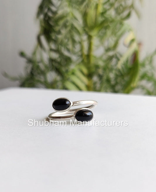Natural Black Onyx Ring, 925 Sterling Silver Ring, Black Onyx Dual Stone Ring, Bypass Adjustable Ring, Tiny Birthstone, Black Stone Jewelry
