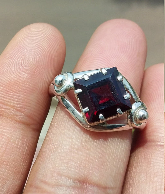 Red Garnet Ring, Square Gemstone Ring, January Birthstone Ring, 925 Silver Handmade Jewellery, Unique Design Ring, Stone Ring Size 7.5