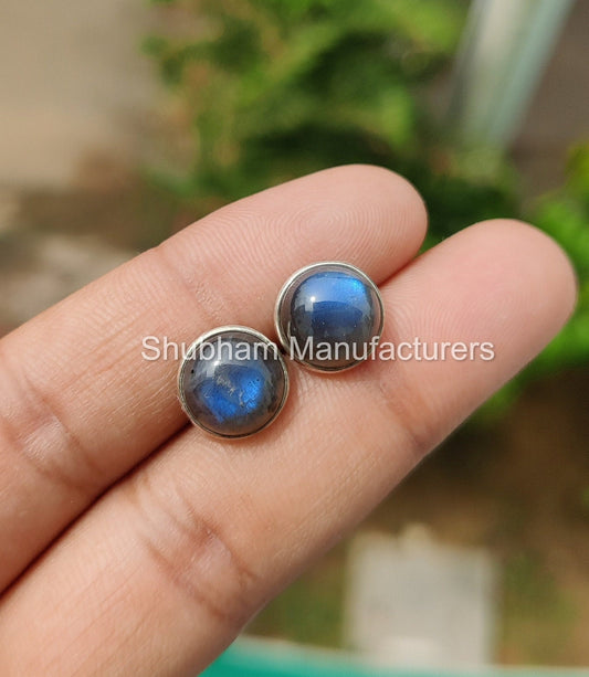 Blue Flash Labradorite Stud Earrings, 925 Sterling Silver Studs, Round Cabochon Studs, Natural Stone, Flashy Gemstone Earrings for Women