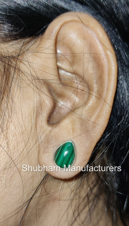 Natural malachite Stud Earrings, 925 Sterling Silver Studs, Simple Earrings for Women, Pear Shape Studs, Birthstone Jewelry,Green Stone Stud