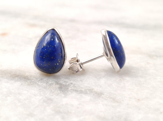 Lapis Lazuli Stud Earrings, 925 Sterling Silver Studs, Natural Blue Lapis, Pear Shape Studs, Cabochon Gemstone, Small Studs for Girls/Women