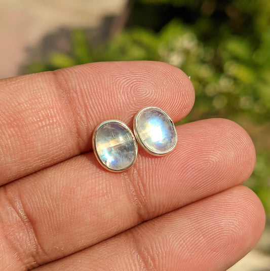 Rainbow Moonstone Studs Earrings, 925 Sterling Silver, June Birthstone, Moonstone Earrings, Gemstone Studs, Blue Flash Moonstone, For Women
